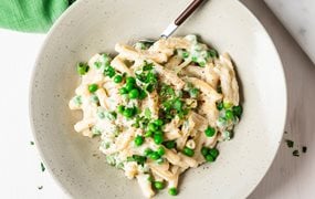 - Die Nudeln mit der Käsesauce mischen und die Erbsen vorsichtig unterheben.