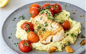 Kabeljau mit Kräuter-Kartoffel-Püree und geschmorten Tomaten