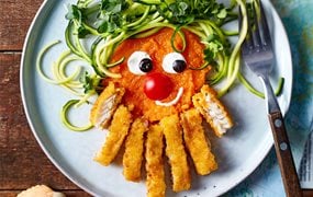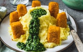 Abenteuerteller: Spinat-Vulkan mit Fischstäbchen