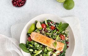 Quinoa-Tabouleh auf Blattspinat mit Atlantik Lachs
