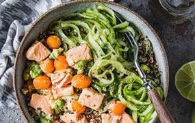 Buddha Bowl mit Quinoa, Gurkennudeln und Lachs mit Sauce Dill-Senf