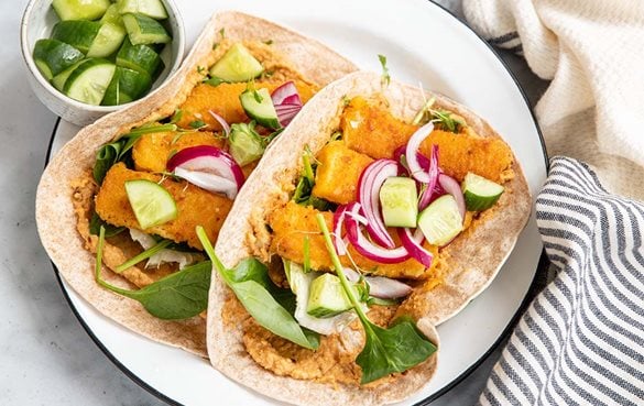 Fischstäbchen-Wraps mit Süßkartoffel-Hummus