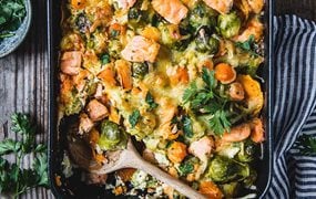Lachs-Auflauf mit Kohlsprossen und Süßkartoffel