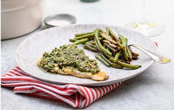 Gegrillter Wolfsbarsch mit Balsamico-Fisolen