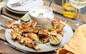 Lachs-Garnelen-Spieße mit Joghurt-Dip