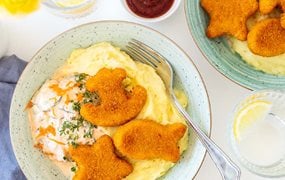 Knusperabenteuer mit Kartoffelpüree und Karotten-Gurken-Salat