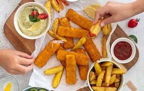 Fischstäbchen-Räuberbrett mit zweierlei Dips