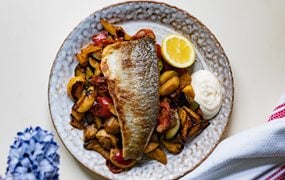 Wolfsbarsch-Streifengemüsepackerl aus dem Ofen