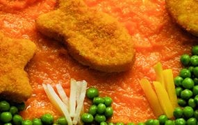 Fischstäbchen mit Kartoffelpüree und Röstgemüse