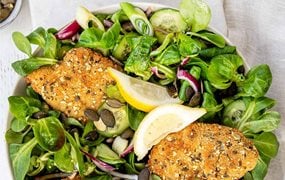 - Für das Dressing alle Zutaten gut vermengen. Vogerlsalat mit Gurken, Frühlingszwiebel und Zwiebeln in einen tiefen Teller geben und mit dem Dressing beträufeln. Backhendlstreifen darüber legen und den Salat mit gerösteten Kürbiskernen garniert servieren.