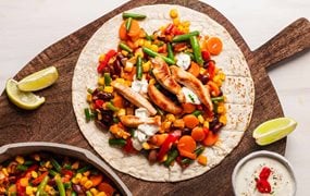 Die Chili fein hacken und unter die Sauce mischen. - Nacheinander die Wraps kurz in einer Pfanne ohne Fett erwärmen. Mit Gemüse und Hühnerbruststreifen belegen, die Sauce darüber verteilen und einrollen.