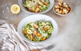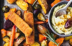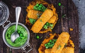 Kürbis-Kartoffel-Puffer mit Erbsencreme und veganen „Fischstäbchen“