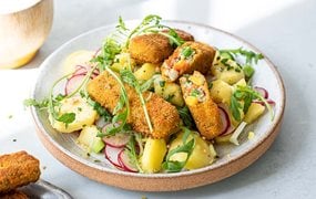 Gemüsestangerl mit Kartoffel-Radieschensalat und Kräuterdip