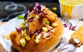 „Fisch“-Hot-Dog mit Mango, Ananas-Mayonnaise und Röstzwiebeln