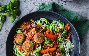 Zoodles mit Broccoli Buchweizen Bolognese und Falafel