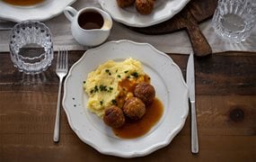 Vegane Bällchen mit Bratensauce und Kartoffelpüree