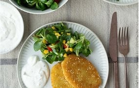 Karfiol Käse Laibchen mit Sauerrahm und Salat