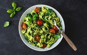 - Währenddessen die Kirschtomaten waschen und halbieren. 2 Minuten vor Schluss zu den Nudeln geben und unterrühren. Cremige Spinat-Pasta vom Herd nehmen, nach Belieben mit Basilikum garnieren und servieren.